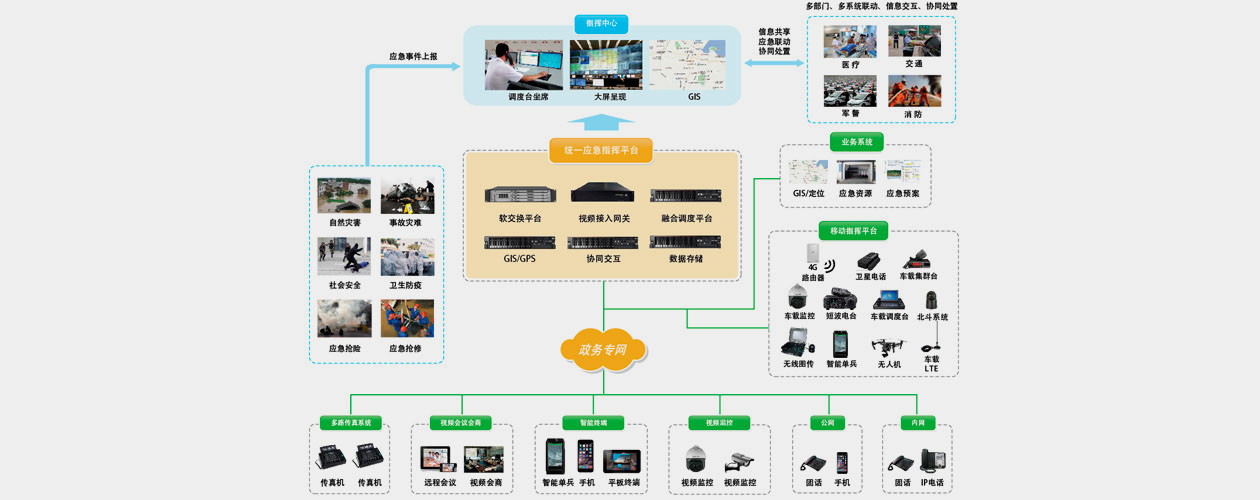 目前,公共安全事件及群體性事件時有發(fā)生,應(yīng)對城市突發(fā)公共事件已成為政府部門一項非常具有挑戰(zhàn)性的工作。如何高效利用有限的資源,提高政府部門對緊急事件快速反應(yīng)和抵御風(fēng)險的能力,并為人民群眾提供更快捷的緊急救助服務(wù),成為政府職能部門的主要工作內(nèi)容之一。政府綜合應(yīng)急指揮調(diào)度系統(tǒng)旨在幫助政府相關(guān)工作部門輕松完成大范圍、不同人員統(tǒng)一通信指揮,實現(xiàn)全員協(xié)同通信、實時可視指揮、資源GIS管控調(diào)度和圖形化任務(wù)交互,具備同時處理多起突發(fā)事件的能力,提高對應(yīng)急事件的能力和應(yīng)急處置效率。